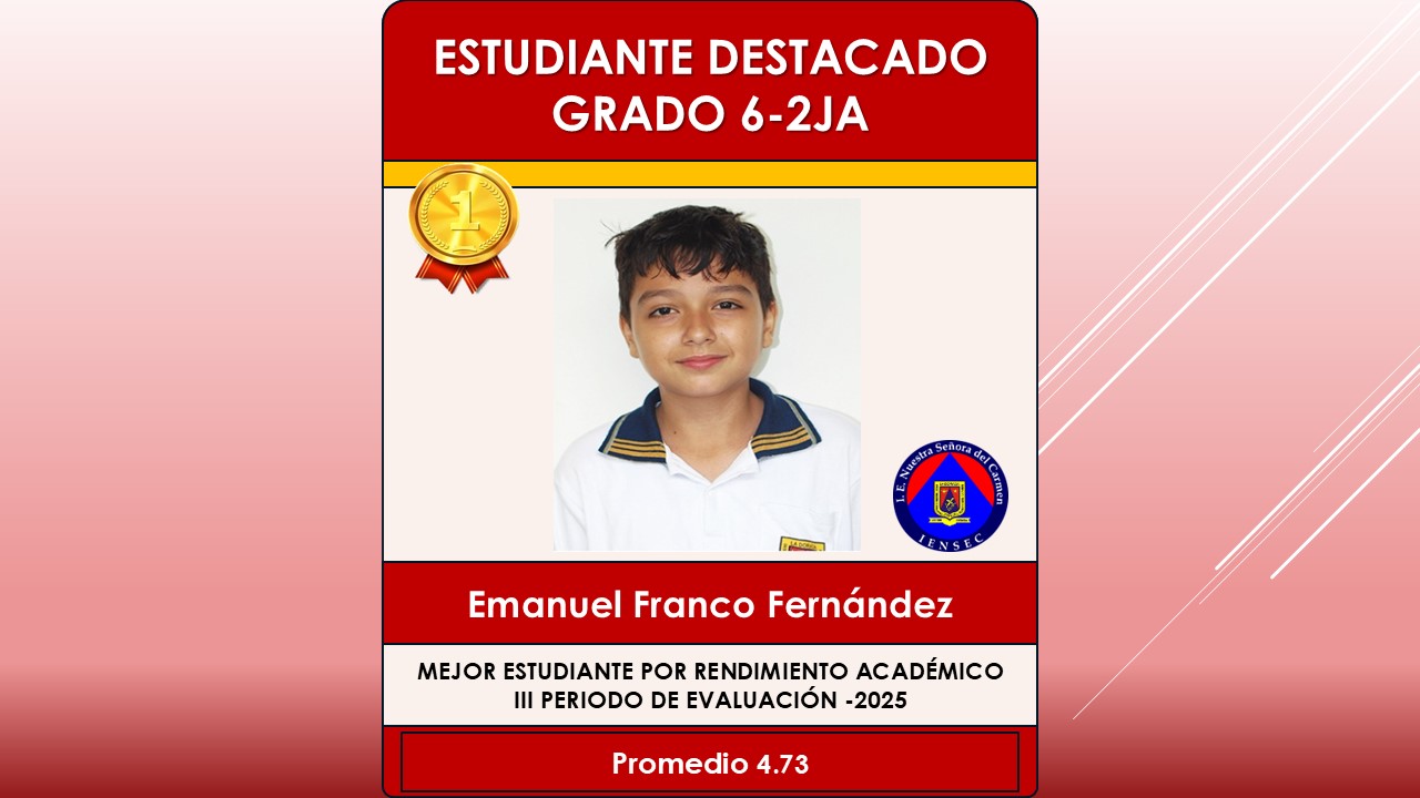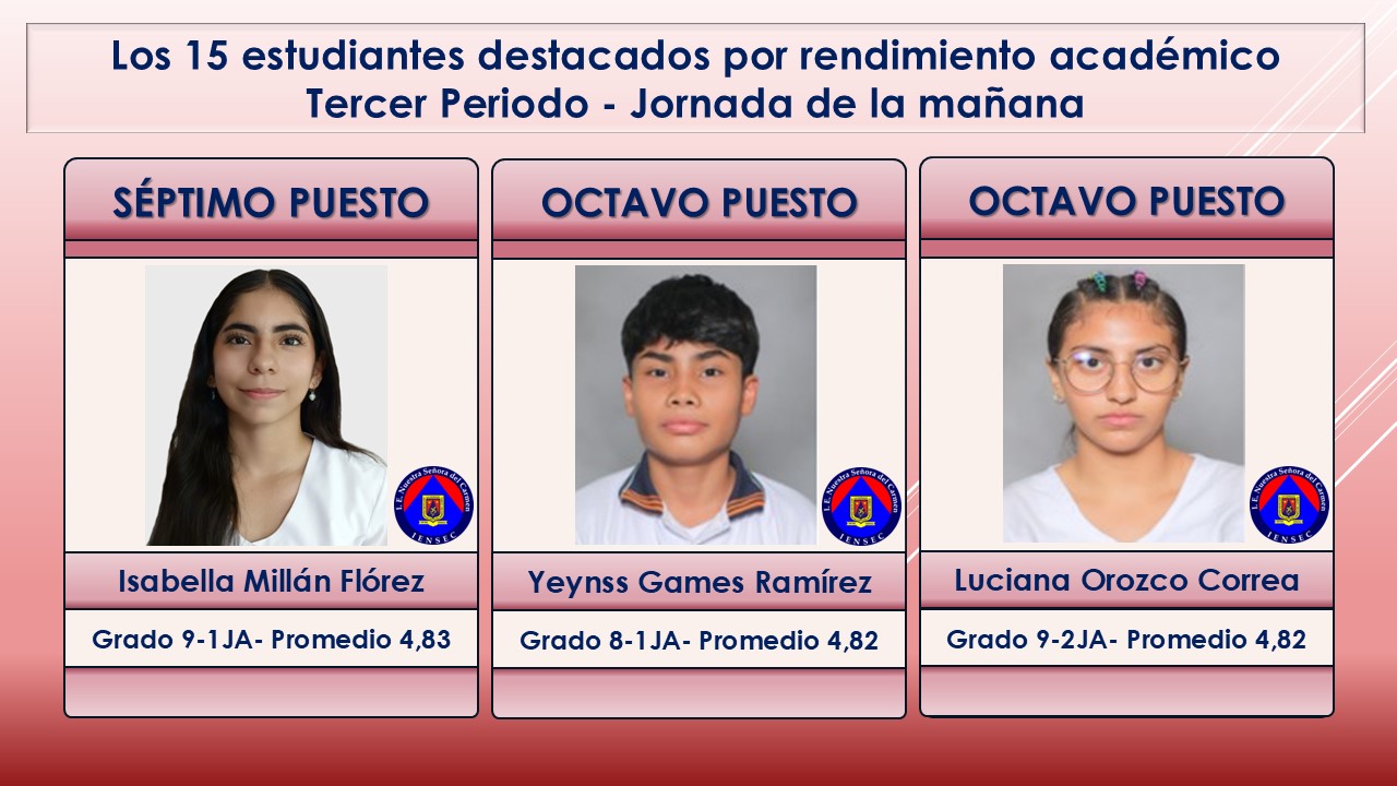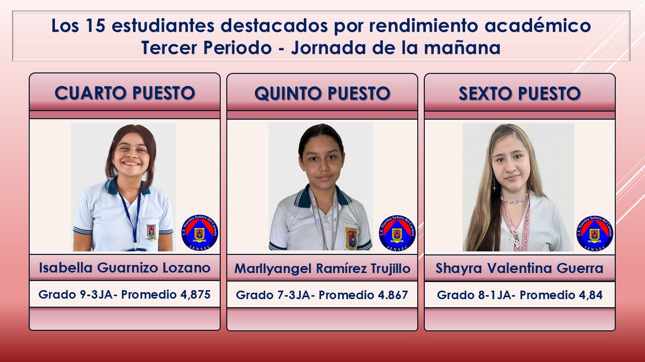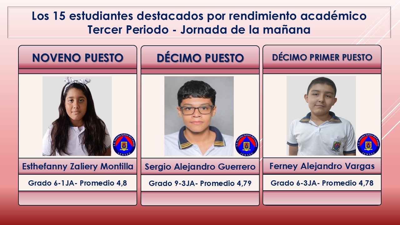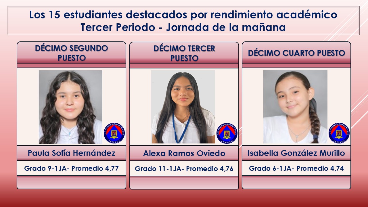 Por: Coordinación JA |La Institución Educativa se complace en exaltar a los mejores estudiantes de la jornada de la mañana, quienes, gracias a su esfuerzo, compromiso y dedicación, han alcanzado un destacado rendimiento académico. Su disciplina y constancia son ejemplo para toda la comunidad educativa, demostrando que con perseverancia y responsabilidad se logran grandes resultados. ¡Felicitaciones por este merecido reconocimiento!
